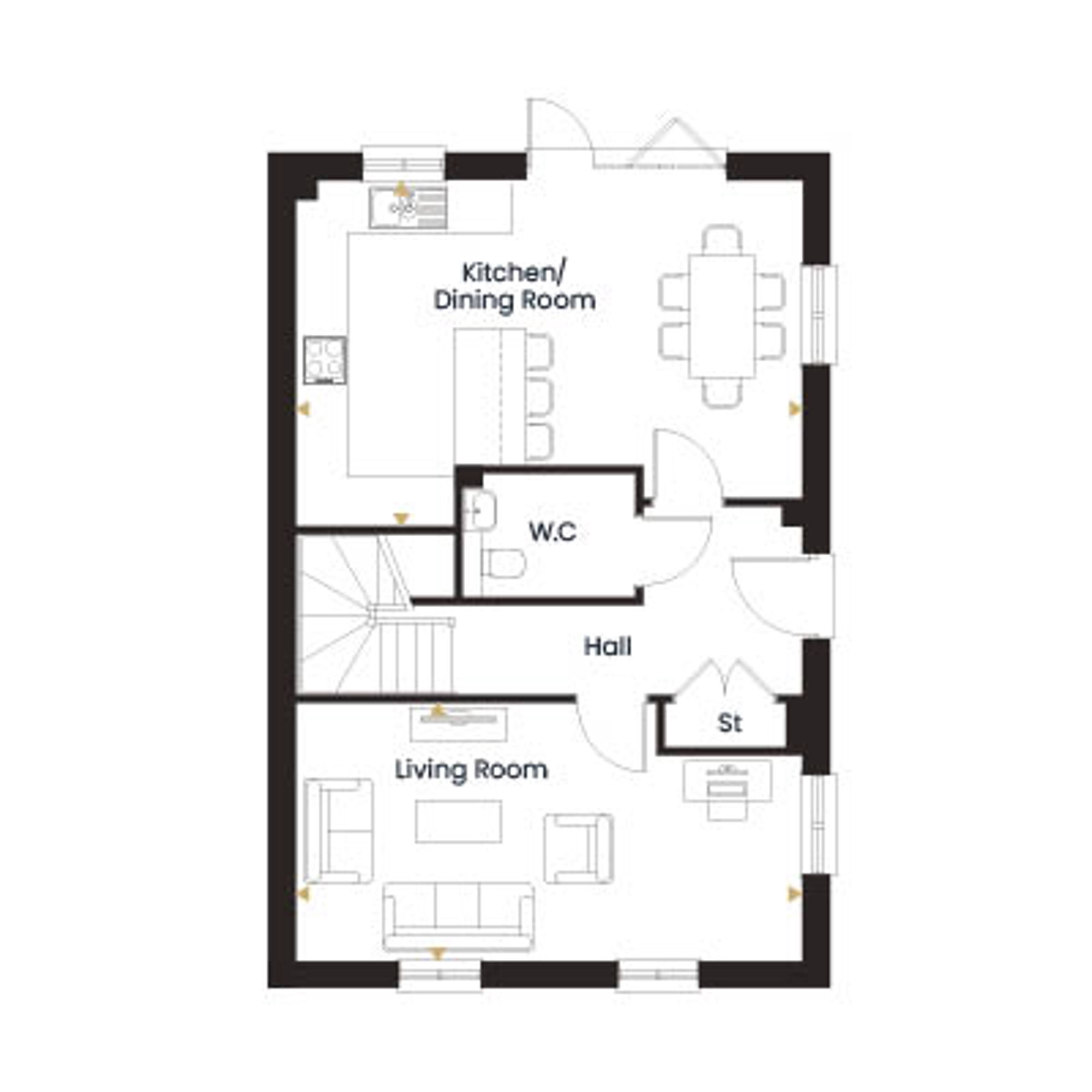 The ground floor is arranged around the way families actually move through a home. The kitchen and dining room sits at the heart of it. A bright, sociable space where the day begins and ends, with integrated appliances and flooring included as standard so it's ready to use before the removal van has left. The living room provides a separate, quieter space to retreat to: somewhere the television goes on, the day unwinds, and the door can be closed on the rest of the house. A downstairs W.C. adds everyday practicality.