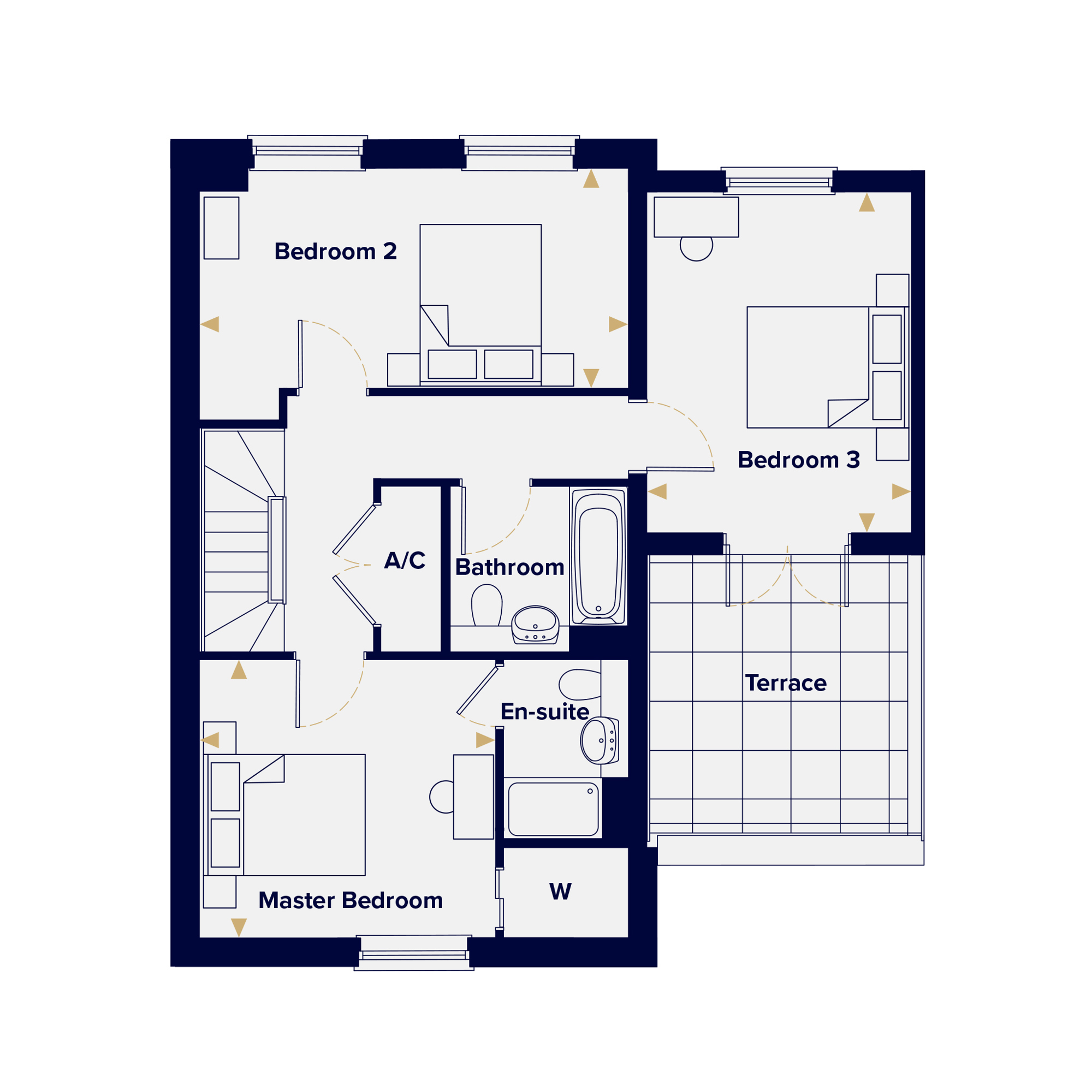 The top floor is where The Alvington truly shines. The master bedroom is a serene and spacious retreat, with a private en suite and fitted wardrobes with sliding doors. Two further double bedrooms, one of which opens onto its very own private terrace, sit alongside a family bathroom, creating a top-floor sanctuary that feels a world away from the everyday. That private terrace is a genuinely rare addition: a personal outdoor space elevated above the neighbourhood, perfect for morning coffee or an evening glass of wine.
