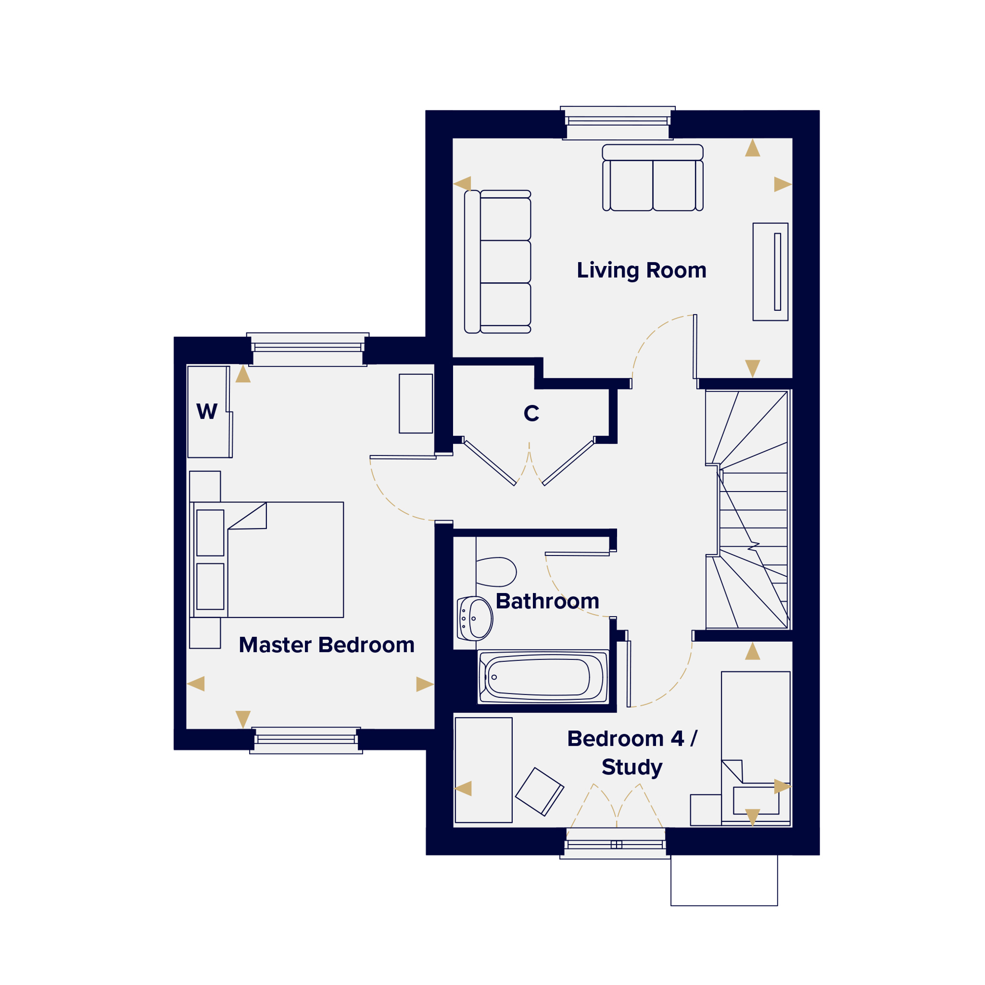 The living room sits on the first floor. That's not a compromise, it's a deliberate decision that gives the living room a quieter position away from the kitchen and a clear separation from the activity of the ground floor. Also on the first floor is the Master bedroom and bedroom four which is the right proportions for a study, dressing room or single bedroom depending on what you need from it.