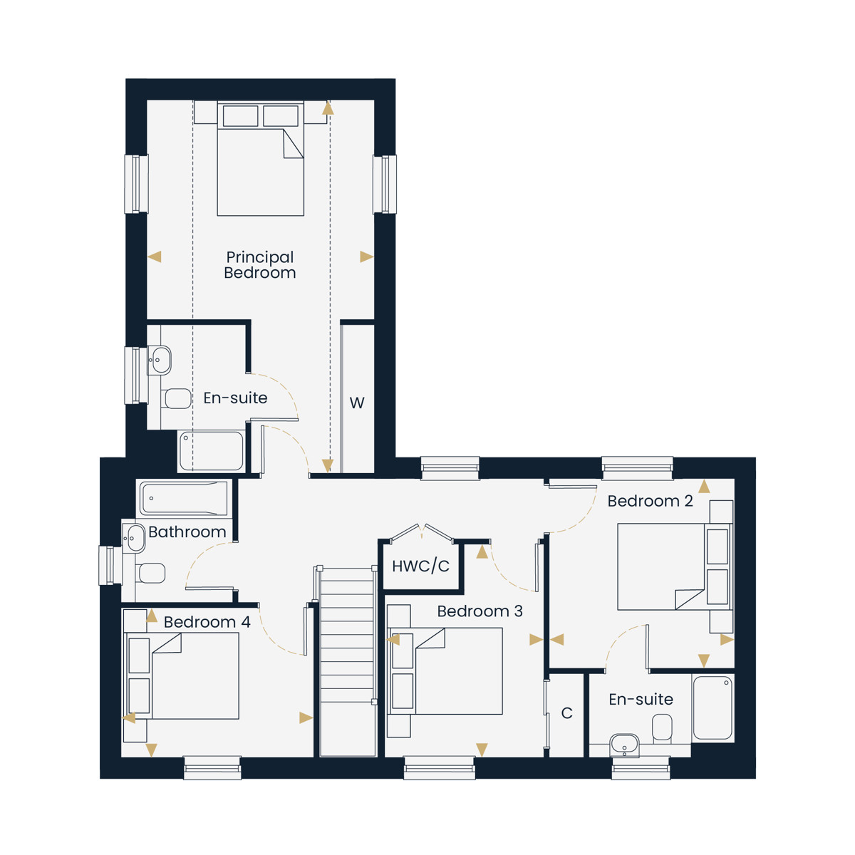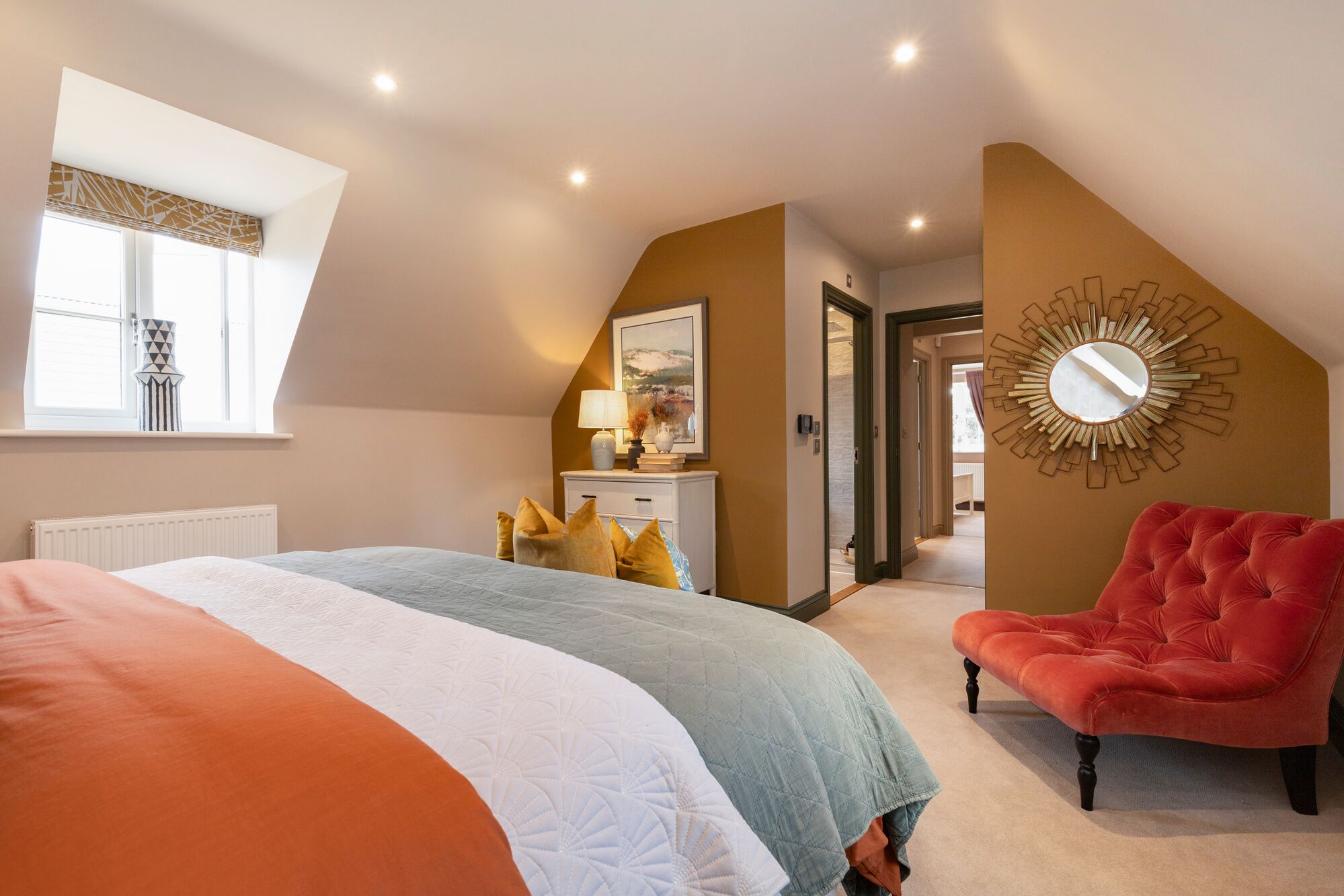 Upstairs, The Chiltern reveals another of its most distinctive features a principal bedroom characterised by charming sloping ceilings and dual-aspect windows that flood the room with natural light, creating a truly unique and atmospheric retreat. With fitted wardrobes and a private en suite shower room, it is a bedroom that feels far removed from the ordinary. Bedroom two is equally well-served, also featuring its own en suite, ideal for guests or older children. Bedrooms three and four both benefit are served by a well-appointed family bathroom, completing a first floor where every bedroom has been genuinely thought through.