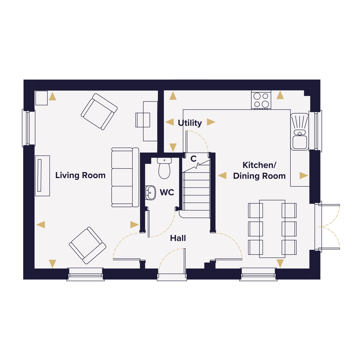 On the ground floor the dual-aspect living room sits to the front, drawing light from two directions, while the open-plan kitchen and dining room runs the same width to the rear, with French doors opening to the garden and a utility area alongside. There's also a cloakroom and additional storage in the hallway.