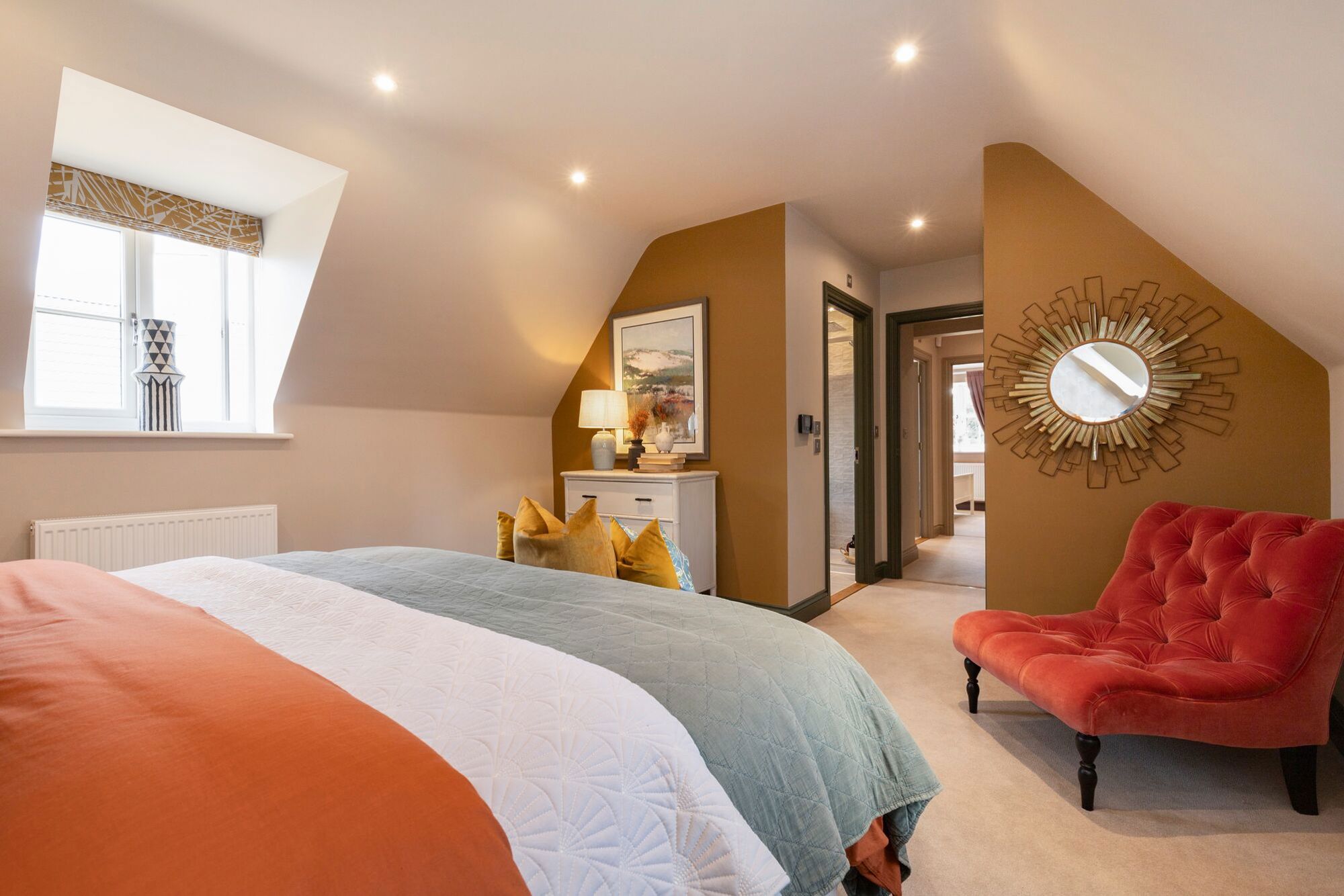 The living room benefits from a dual aspect, which means light comes in from two directions and the room never feels dark whatever the time of day. French doors open to the rear garden. At its heart is a reclaimed brick fireplace with wood burner, a working fire is rare in new-build homes, and it's the kind of feature that makes a room feel genuinely lived in from the moment you move in.