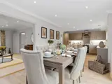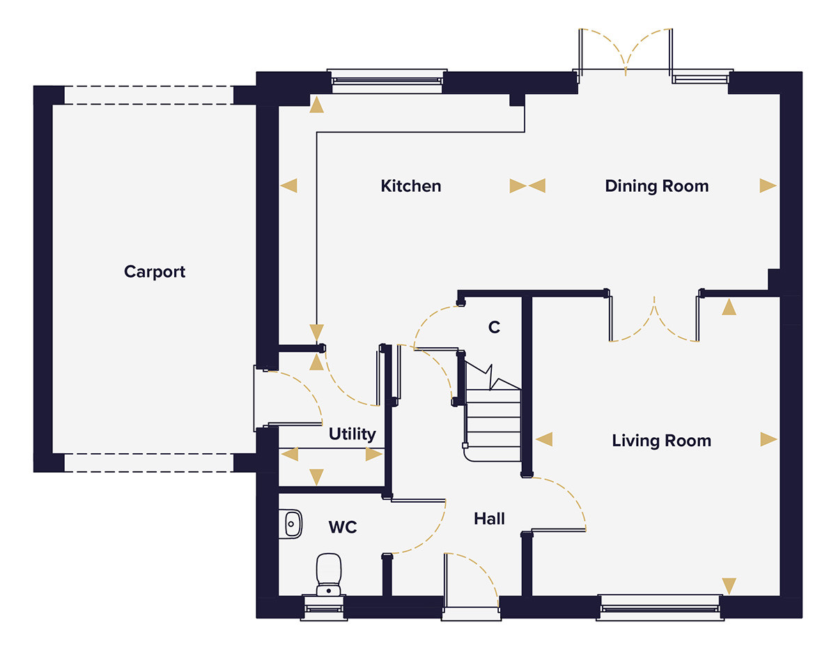 On the ground floor, the living room and open-plan kitchen and dining area are separated by double doors, so the spaces connect when you want them to and feel distinct when you don't. French doors from the dining area lead directly to the rear garden. The kitchen connects through to a utility room with its own rear door — which opens straight into the covered carport, making it a practical route in with shopping or muddy dogs. Additional storage in the hallway means the everyday clutter has somewhere to go.