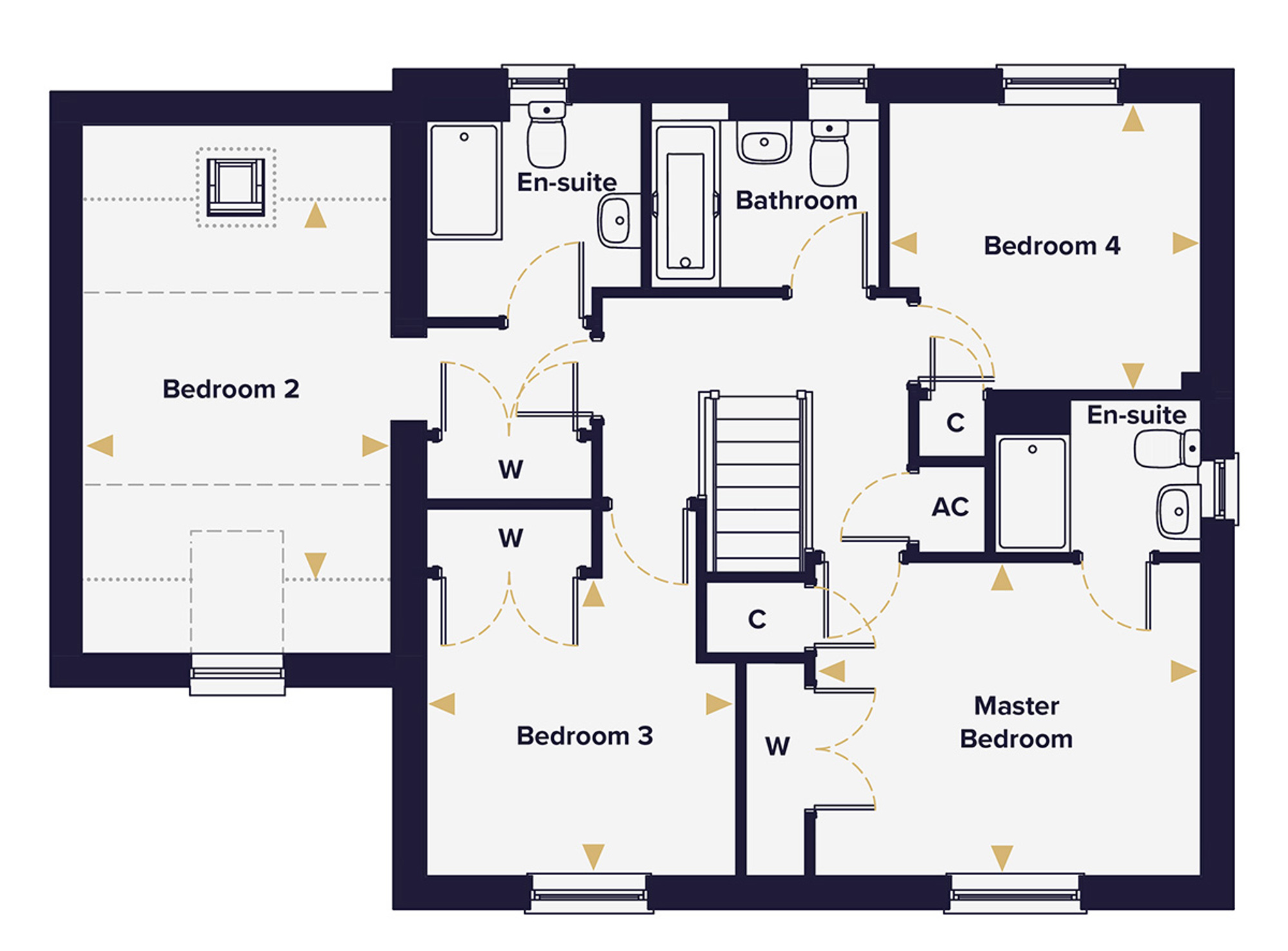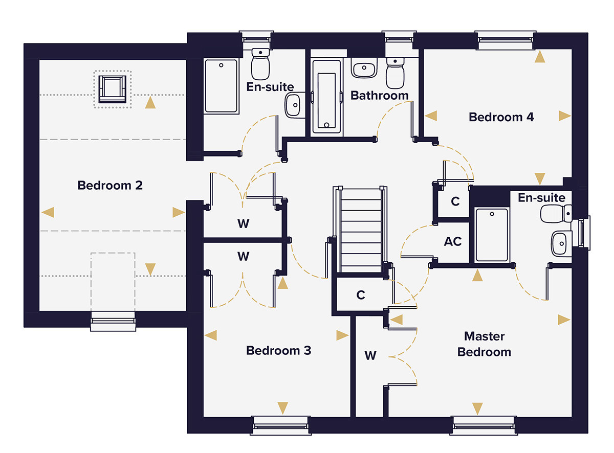 Upstairs is where the Hingham earns its character. The principal bedroom and Bedroom 2 both have double fitted wardrobes and en suite shower rooms. Two en suites in a four-bedroom home is uncommon and makes a real practical difference for families. But it's Bedroom 2 that stands out architecturally: sloping ceilings, a rooflight and dual-aspect windows give it the feel of a room that's been thought about rather than just fitted in. Bedrooms 3 and 4 are both proper doubles, served by a good-sized family bathroom.