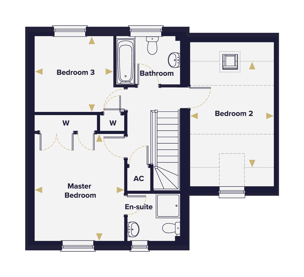 Upstairs is where the Sutton really excels. The principal bedroom has triple fitted wardrobes, more storage than most bedrooms and an en suite shower room. Bedroom 2 has sloping ceilings, dual-aspect windows and a rooflight, giving it the kind of architectural character you'd more usually find in a converted property than a new build. Bedroom 3, is a comfortable third room that works as a bedroom, home office or nursery. A family bathroom serves Bedrooms 2 and 3.