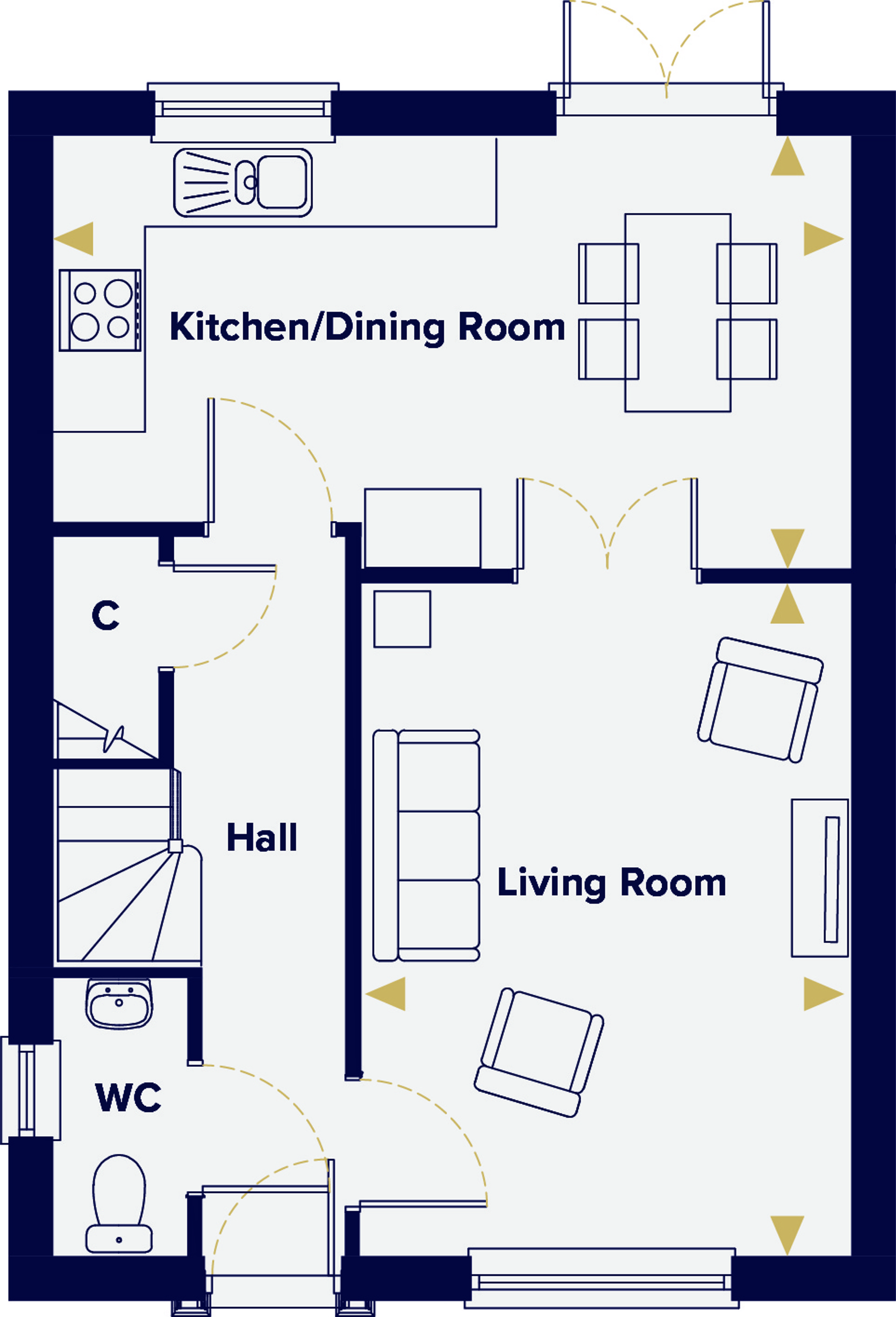 The ground floor is built around a living room, reached through double doors from the open-plan kitchen and dining roon with French doors to the rear garden. A cloakroom and hallway storage sit off the entrance.