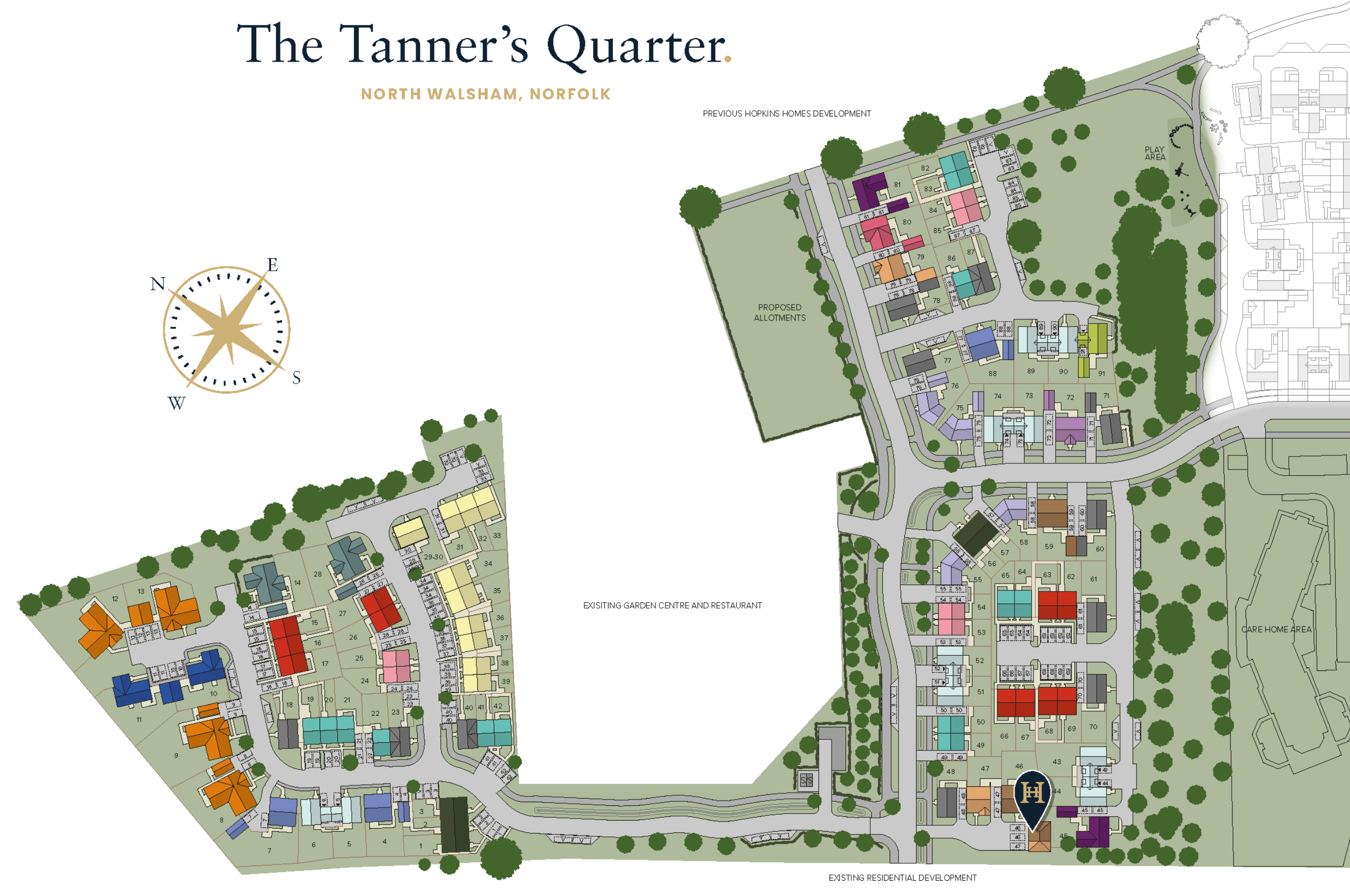 Floor plans and dimensions can only be given as a guide and are indicative of the House Type only. These are liable to change as build progresses; please speak to the Sales Consultant for plot specific information. The computer generated images, floor plans, configurations and layouts are included for guidance only. Photos are indicative only of previous Hopkins Homes properties. External finishes, landscaping and levels will vary, please refer to drawings in sales office. Trees on site layout are unlikely to represent actual volume, type or scale. Development layout not to scale, for indication only.